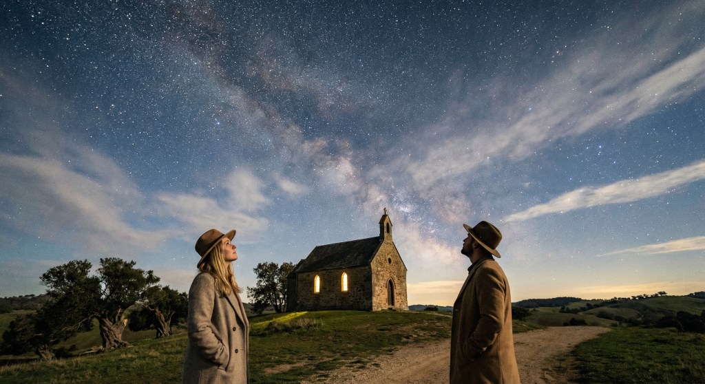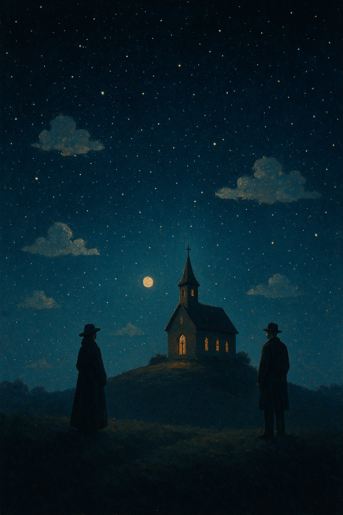 nächtlicher Sternenhimmel, kleine Wolken, in der Bildmitte eine kleine Kirche auf einem Hügel, links neben der Kirche steht eine Frau in einem Mantel und mit einem Hut, rechts neben der Kirche steht ein Mann in einem Mantel und mit einem Hut
