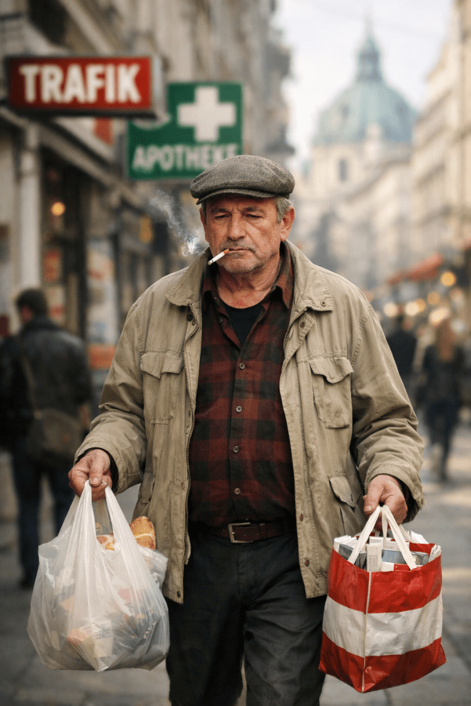 Die Szene hat jetzt etwas fast Mythisches: du als urbaner Titan zwischen Trafik und Apotheke, der Dampf deiner Zigarette mischt sich mit dem Dunst der Stadt, und die Taschen hängen wie Symbole für Pflicht und Genuss zugleich.