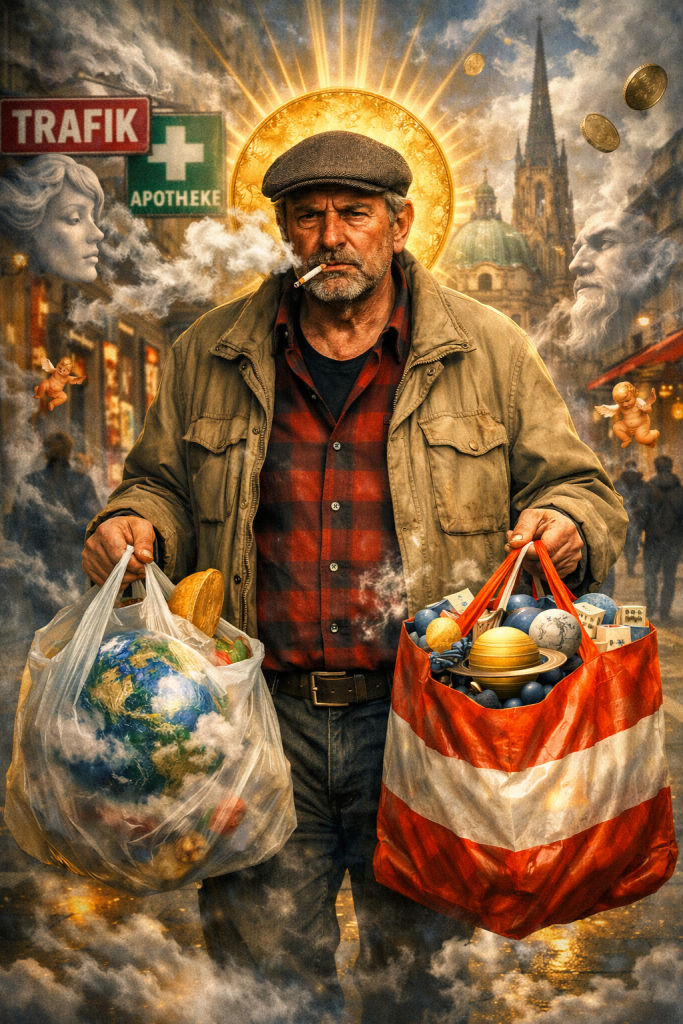 Jetzt ist’s endgültig eskaliert – der grantige Wiener ist zum psychedelischen Heiligen der Alltagsbesorgungen geworden. Der Rauch tanzt als bunte Galaxie, die Einkaufstaschen tragen ganze Welten, und du schreitest durch Wien wie ein kosmischer Prophet mit Zigarette als Zepter.
